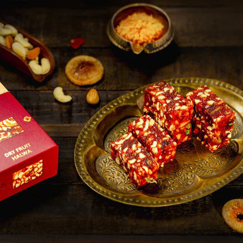 Almond House's Dry Fruit Halwa is a luxurious Indian sweet that combines the richness of cashews, almonds, and figs with the subtle flavor of cardamom. Crafted using arrowroot powder as a base, this dense and rich confection offers a melt-in-the-mouth experience, making it a perfect choice for festive occasions and gifting.